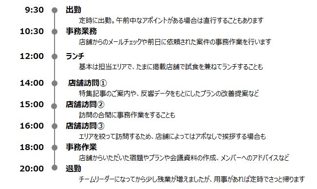OZmallのレストラン予約の営業として、店舗の反響が上がるよう、掲載ページのブラッシュアップや食事プランのご提案、口コミ点数維持のための注意喚起など、さまざまな提案を行っています。店舗訪問は、1日に多くて午前に1件、午後3件。店舗の営業時間外の14:00~17:00が多く、午前にアポがない日は、会議や店舗への提案準備を行います。帰社後の17:00以降、その日に店舗から依頼された案件や社内会議資料の作成等、さまざまな事務作業があります。