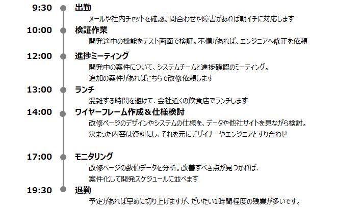 Webディレクター業務は、デザイナーやエンジニアなどたくさんの方がかかわってくるため、コミュニケーション力と段取力が求められます。営業や編集から「こういう改修をしたい」という要望をたくさんもらうのですが、難易度や影響力を加味して優先順位をつけなければなりません。また、改修して終了ではなく、そこからどれだけ予約が増えたか、何がその要因か、改善すべき点は何かの仮説を立て、検証するPDCAサイクルを常に回す必要があります。感覚だけではなく、データで検証していくので、マーケティングの知識は必須となります。