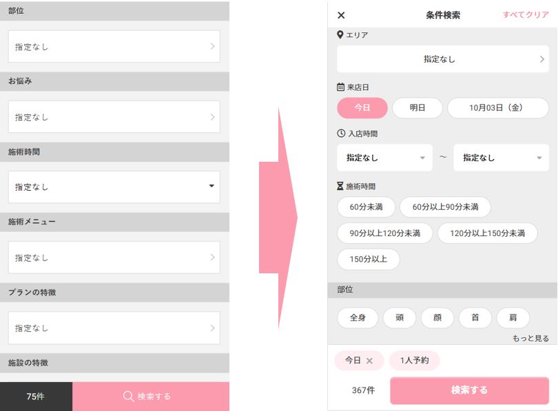 ユーザーテストであがった課題点を元に、リラクサービスの検索パネルを改修しました。ユーザーの操作をみて、使いづらい機能がないか定期的に調査しています。ぱっと見て分かりやすいデザインに変更したのと同時に、よく使用されている絞り込み項目を上に配置することで工夫しました。離脱率が下がったのと同時に、サロンへの予約率改善にも繋がりました。